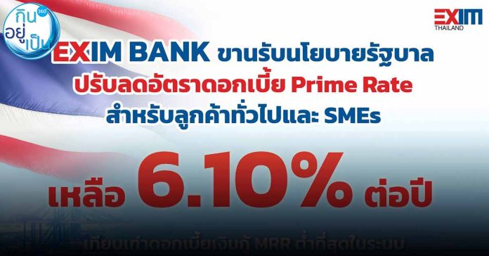 EXIM BANK ยืนหยัดช่วยเหลือผู้ประกอบการด้วยการปรับลดอัตราดอกเบี้ย Prime Rate เหลือ 6.10% ต่อปี ต่ำที่สุดในระบบอย่างต่อเนื่อง มีผลตั้งแต่วันที่ 18 สิงหาคม 2568 เป็นต้นไป