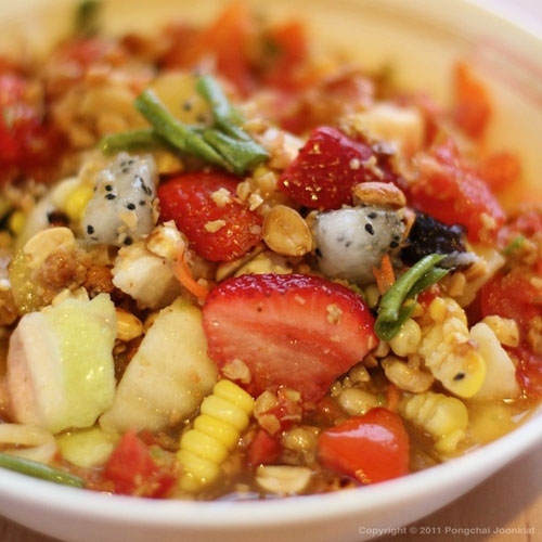 3. ใส่มะละกอดิบ ตามด้วยผลไม้ คลุกเคล้าให้เข้ากัน จัดใส่จาน และโรยหน้าด้วยฟองเต้าหู้กรอบ วางคู่กับผักสดต่างๆ เตรียมเสิร์ฟได้เลย
