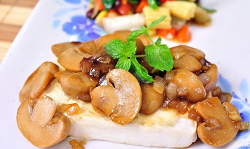เมนูของคนรักสเต็ก แต่เป็นเต้าหู้แทน ได้อารมณ์การทานสเต็กเนื้อสัตว์ หั่นเต้าหู้เป็นชิ้นเล็กๆ ทานคู่กับซอสเห็ดทำให้การทำบุญครั้งนี้ อิ่มอร่อย และทำให้ตัวเองมีความสุขอีกต่างหาก