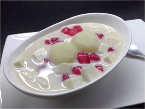 4. จากนั้น ตักทับทิมกรอบที่ได้ ใส่ภาชนะ เทนมถั่วเหลืองชนิดหวาน และ เต้าหู้คินุ จัดเสิร์ฟ