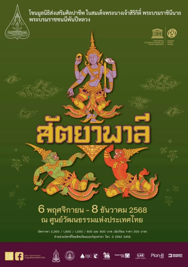 🎭 โขนมูลนิธิส่งเสริมศิลปาชีพฯ ตอน “สัตยาพาลี” จัดแสดงระหว่างวันที่ 6 พฤศจิกายน – 8 ธันวาคม 2568 ณ หอประชุมใหญ่ ศูนย์วัฒนธรรมแห่งประเทศไทย