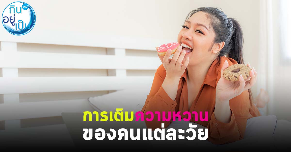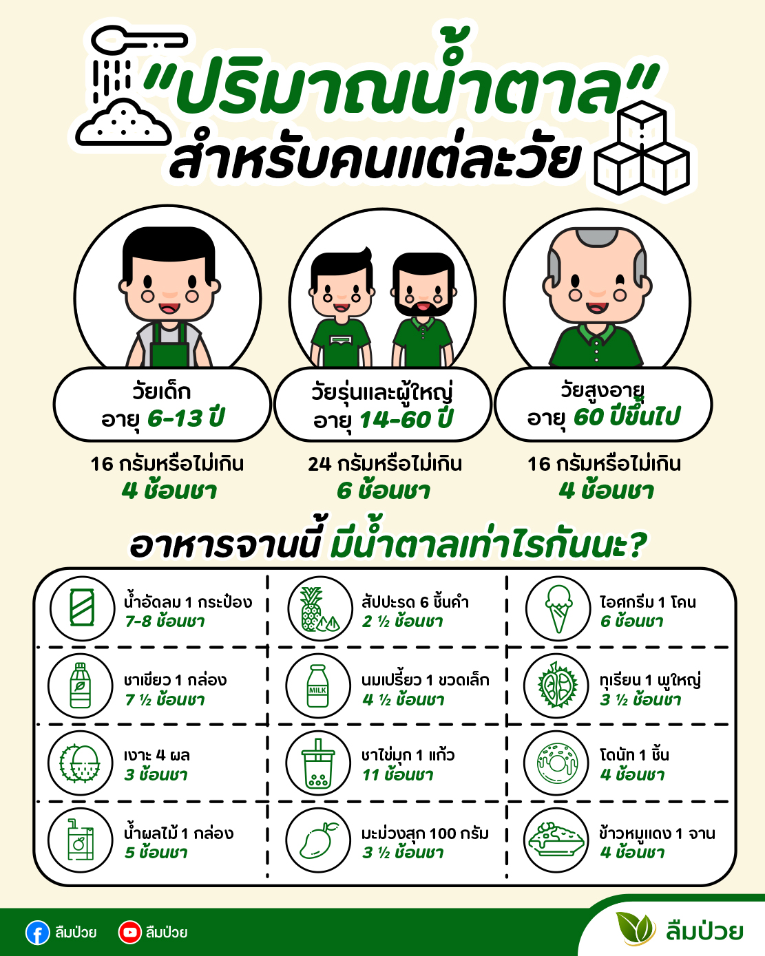 ก่อนที่ทุกคนจะเติม(กิน)ของหวานในแต่ละครั้ง เรามาดูปริมาณน้ำตาลที่เหมาะสมกับแต่ละช่วงวัยกันดีกว่า โดยจากผลการสำรวจของ สสส. พบว่าคนไทยกินน้ำตาลมากถึง 20 ช้อนชาต่อวัน ซึ่งเป็นปริมาณที่เกินความต้องการของร่างกายถึง 3 เท่า!!!!! และเด็กที่อายุน้อยกว่า 15 ปีก็เป็นเบาหวานกันเพิ่มขึ้นด้วย จริงๆ แล้วเรากินน้ำตาลได้ไม่เกิน 6 ช้อนชาต่อวันเท่านั้น ส่วนเด็กและวัยสูงอายุไม่ควรกินเกิน 4 ช้อนชา แต่แค่น้ำอัดลมกระป๋องเดียวก็มีน้ำตาลไป 7 ช้อนชาแล้ว