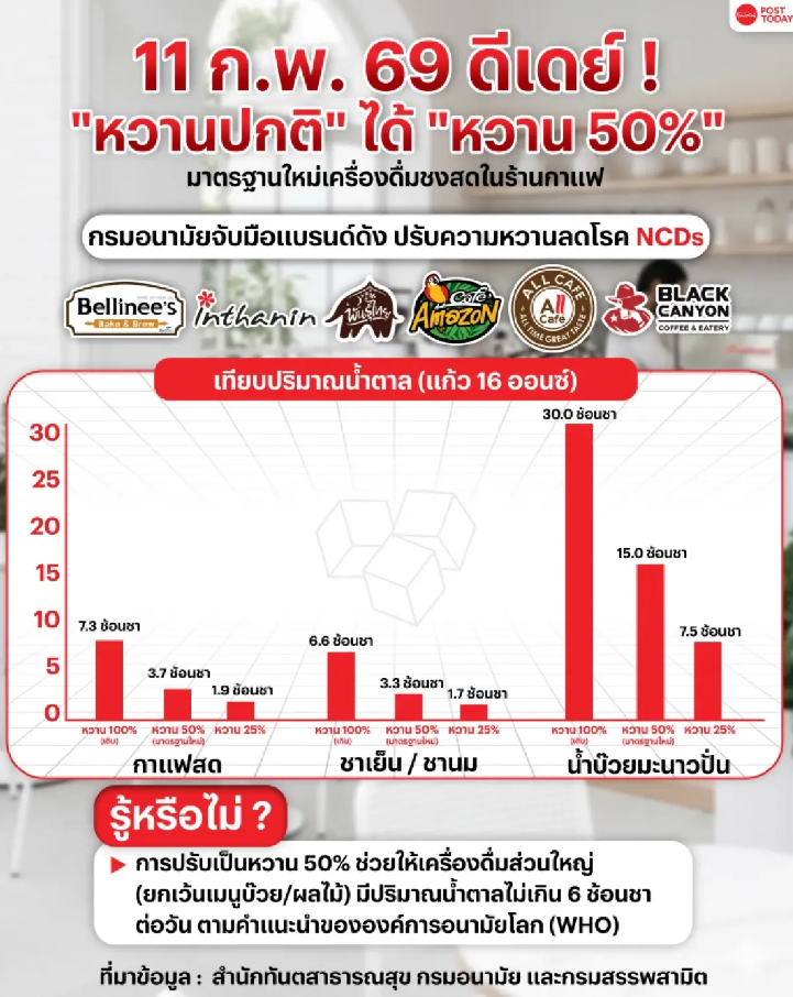 11 กุมภาพันธ์ 2569 เป็นไป กรมอนามัย เริ่มเลยย!! ใครสั่งเครื่องดื่มปกติจากรสชาติที่เคยได้ อาจเปลี่ยนไป ความหวานที่ได้อาจลดไปครึ่งนึง ไม่ต้องแปลกใจไป เพราะกรมอนามัยเค้าเป็นห่วงทุกคน บอกเลย กินอยู่เป็น 360 องศาแห่งการใช้ชีวิต ถูกใจข่าวนี้มาก